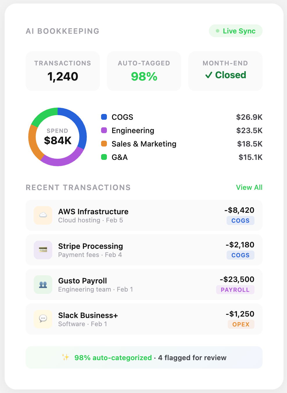 AI-powered categorization eliminates 90 percent of manual entry by learning transaction patterns from payment processor metadata. The system recognizes recurring charges, identifies vendor patterns, and suggests appropriate categories based on historical treatment.