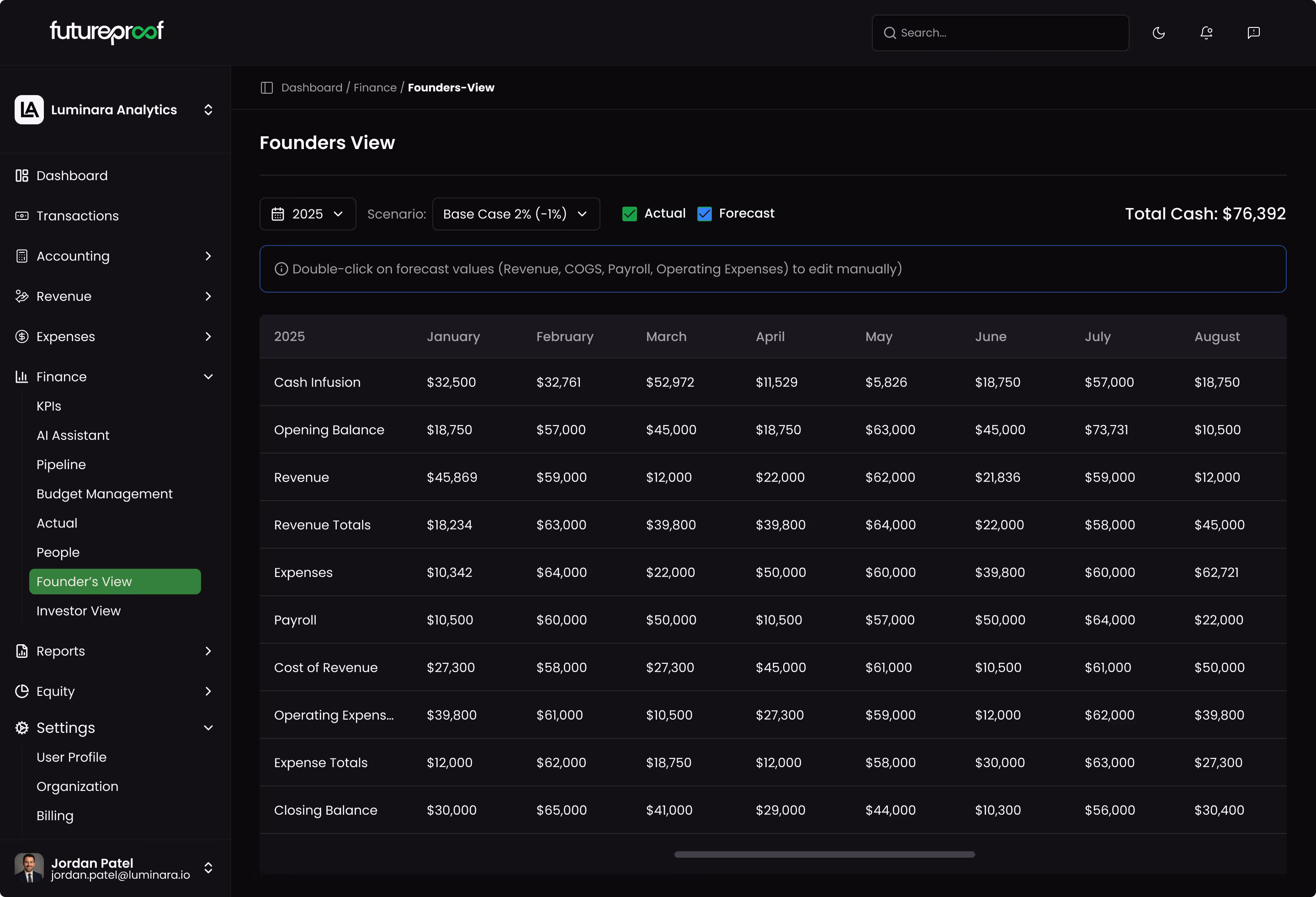 While QuickBooks focuses on recording historical transactions, Futureproof is built for forward-looking founders who need to see around corners.